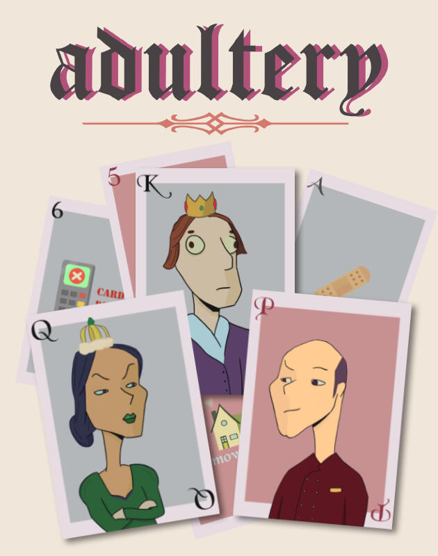 Adultery evolved from an early prototype called Matchmaker. The objective of this game was to be the first person to match your Queen to a King by stacking cards in their lanes. The game was not very dynamic or exciting and it lacked a clear sense of itself. So from here, we carried over some core features, but rebuilt the game. We strengthened the theme and made the decision to make this a cooperative game that requires strategy.