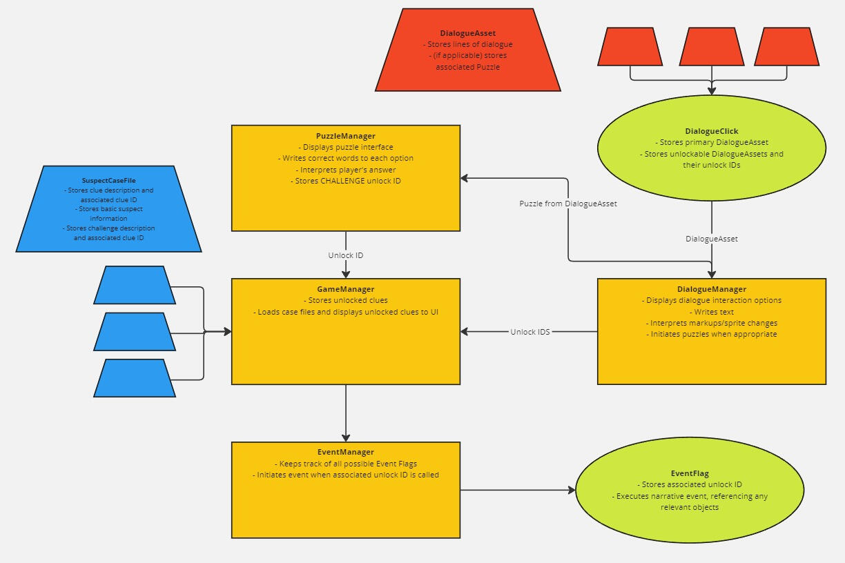 As the programming lead, I developed a custom (no plugin) narrative system that allows for a detective style point and click, with unlockable clues and dialogue. Features include: Visual novel style text with typewriter effect and sprite changes, cutscene functionality, unlockable suspect information and dialogue, logic puzzle integration, and more!